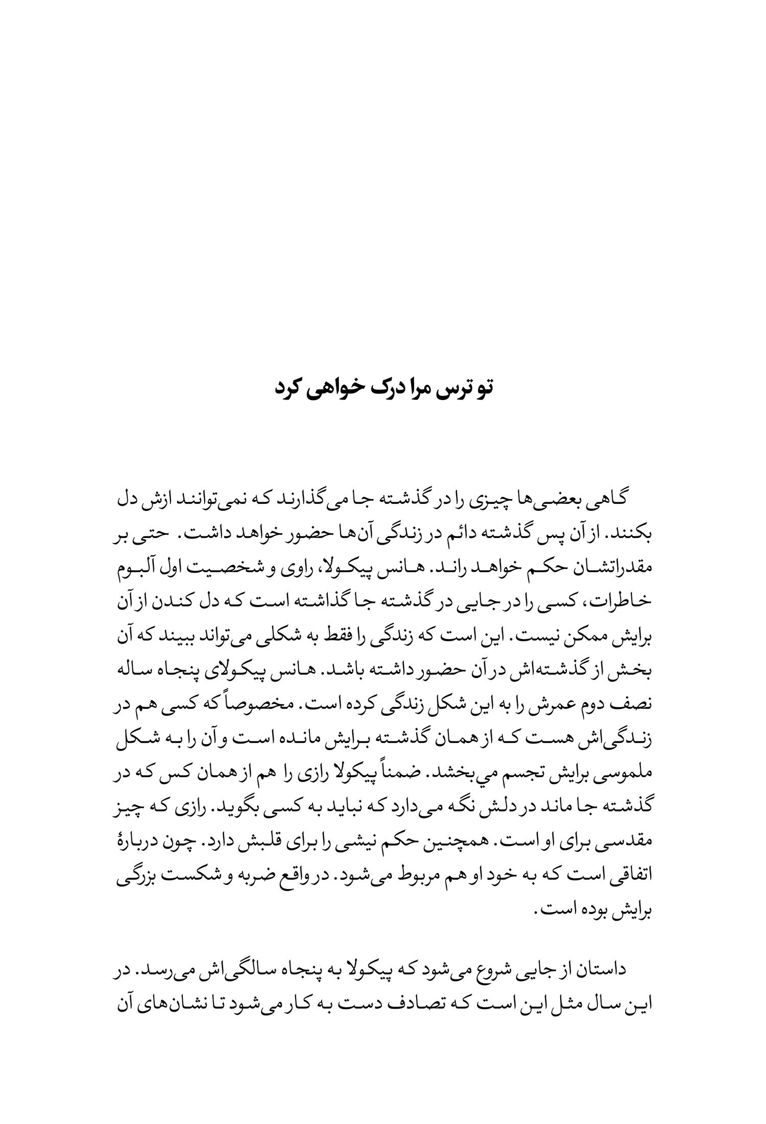 رفت بهسمت ميزى که مردی با یونیفرم خاکسترىِ مایلبهآبی پشتش نشسته بود و اسم من را به او گفت. مرد دفتری را بهطرف من هُل داد و به جايى ميان دو خط اشاره کرد تا امضا کنم. اسمم را هانس پيکولا[1] امضا کردم و دوباره چند پلۀ دیگر هم بهدنبال آن دو تا لنگ پايين رفتم.