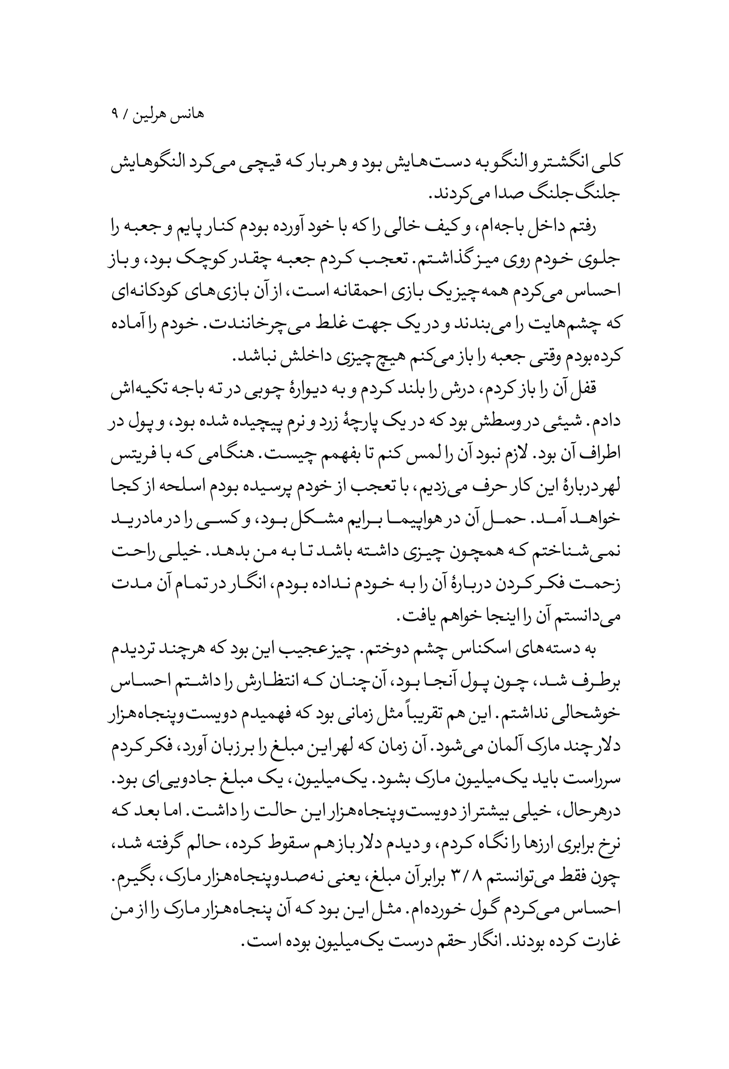 به دستههاى اسکناس چشم دوختم. چيز عجيب اين بود که هرچند ترديدم برطرف شد، چون پول آنجا بود، آنچنان که انتظارش را داشتم احساس خوشحالى نداشتم. این هم تقریباً مثل زمانی بود که فهمیدم دویستوپنجاههزار دلار چند مارک آلمان میشود. آن زمان که لهر این مبلغ را بر زبان آورد، فکر کردم سرراست باید يکميليون مارک بشود. يکميليون، یک مبلغ جادوییای بود. درهرحال، خيلى بیشتر از دویستوپنجاههزار این حالت را داشت. اما بعد که نرخ برابرى ارزها را نگاه کردم، و دیدم دلار باز هم سقوط کرده، حالم گرفته شد، چون فقط میتوانستم 8/3 برابر آن مبلغ، يعنى نهصدوپنجاههزار مارک، بگيرم. احساس میکردم گول خوردهام. مثل این بود که آن پنجاههزار مارک را از من غارت کرده بودند. انگار حقم درست يکميليون بوده است.