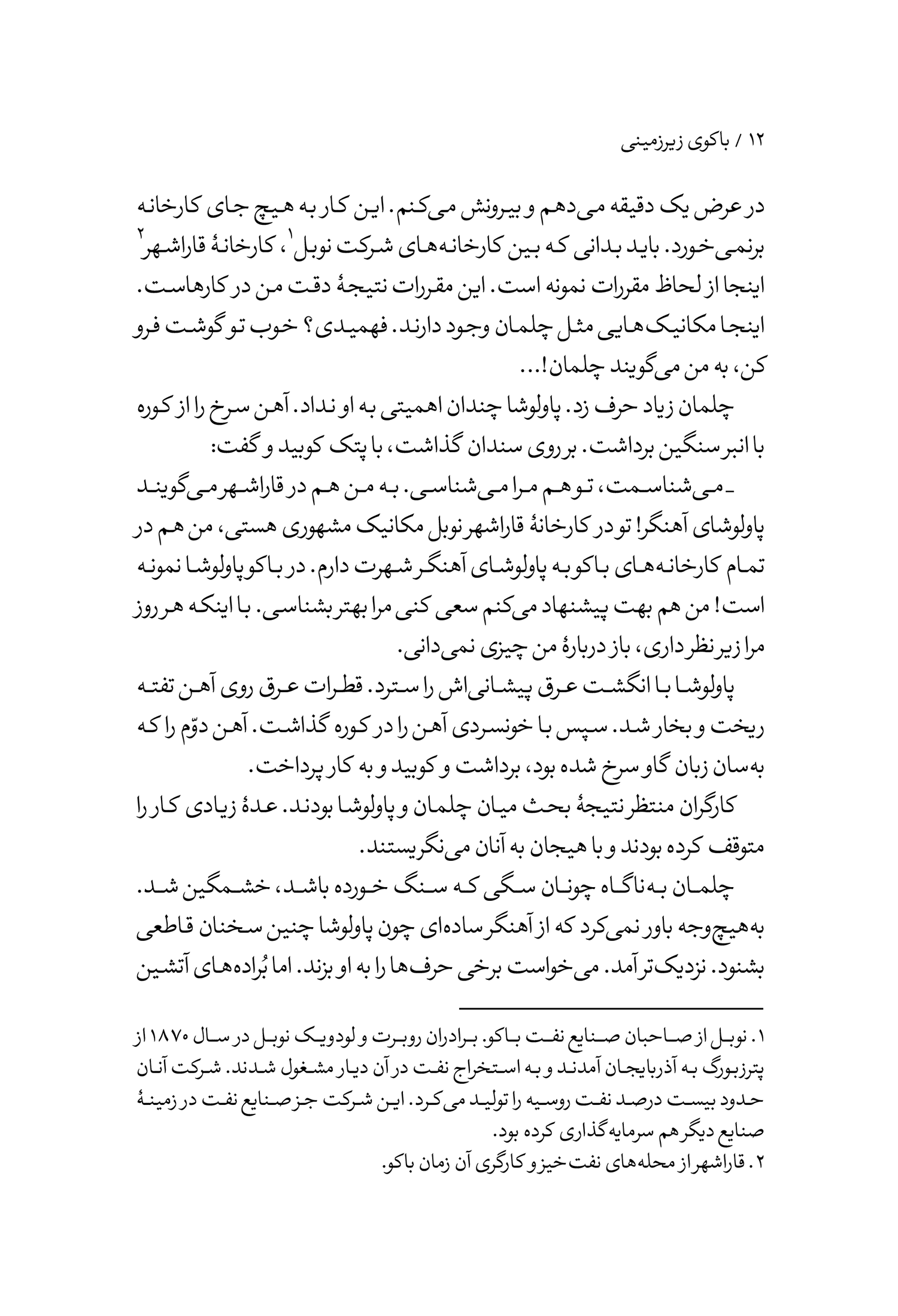 _ خوب به چشمهای من نگاه کن! اینجا کارخانه است. جای حرفهای مخفی نیست. تو باید برای همیشه بدانی که من حساب صدها آهنگر مثل تو را در عرض یک دقیقه میدهم و بیرونش میکنم. این کار به هیچ جای کارخانه برنمیخورد. باید بدانی که بین کارخانههای شرکت نوبل[1]، کارخانۀ قاراشهر[2] اینجا از لحاظ مقررات نمونه است. این مقررات نتیجۀ دقت من در کارهاست. اینجا مکانیکهایی مثل چلمان وجود دارند. فهمیدی؟ خوب تو گوشت فرو کن، به من میگویند چلمان!…