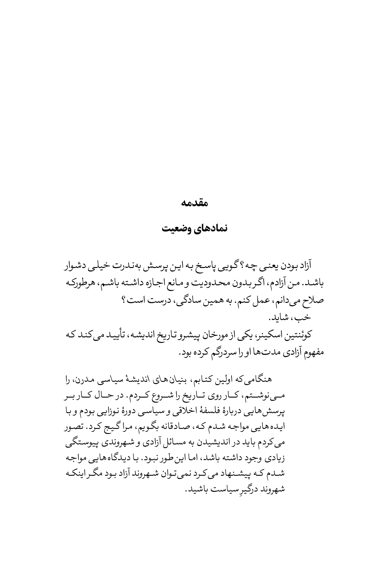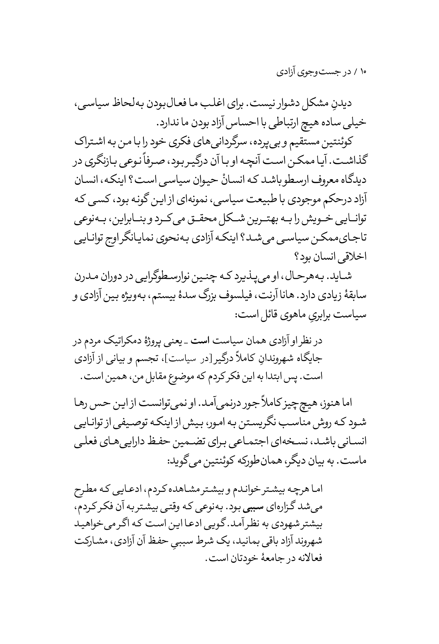 آزادی چیست و شهروند آزاد کیست؟ آیا آزادی صرفاً رها بودن از قید و مانع است، یا وضعیتِ زیستن در جامعهای است که هیچ قدرت خودسرانهای بر ما سلطه ندارد؟ در جستوجوی آزادی، با ارائه دیدگاههای کوئنتین اسکینر، بنیانگذار مکتب کمبریج در تاریخ اندیشۀ سیاسی، تبار این مفهوم را از جمهوری روم، سیسرو و ماکیاولی آغاز میکند و تا مباحث امروز دربارة آزادی فردی، دموکراسی و قدرت خودکامه پی میگیرد.