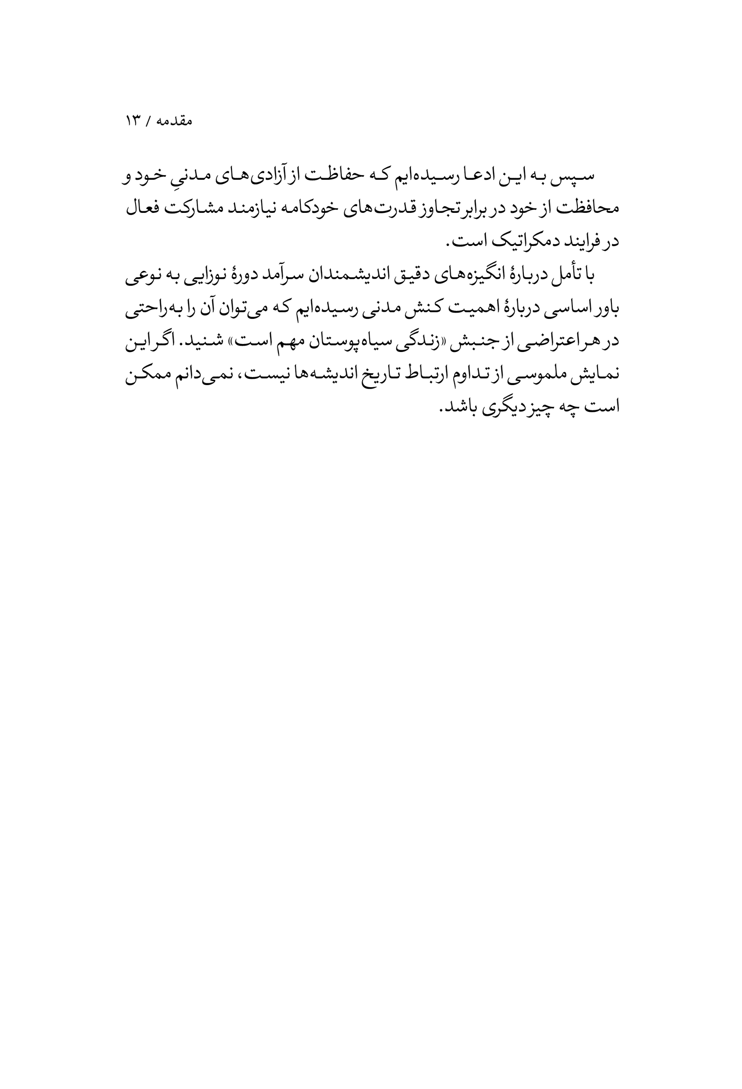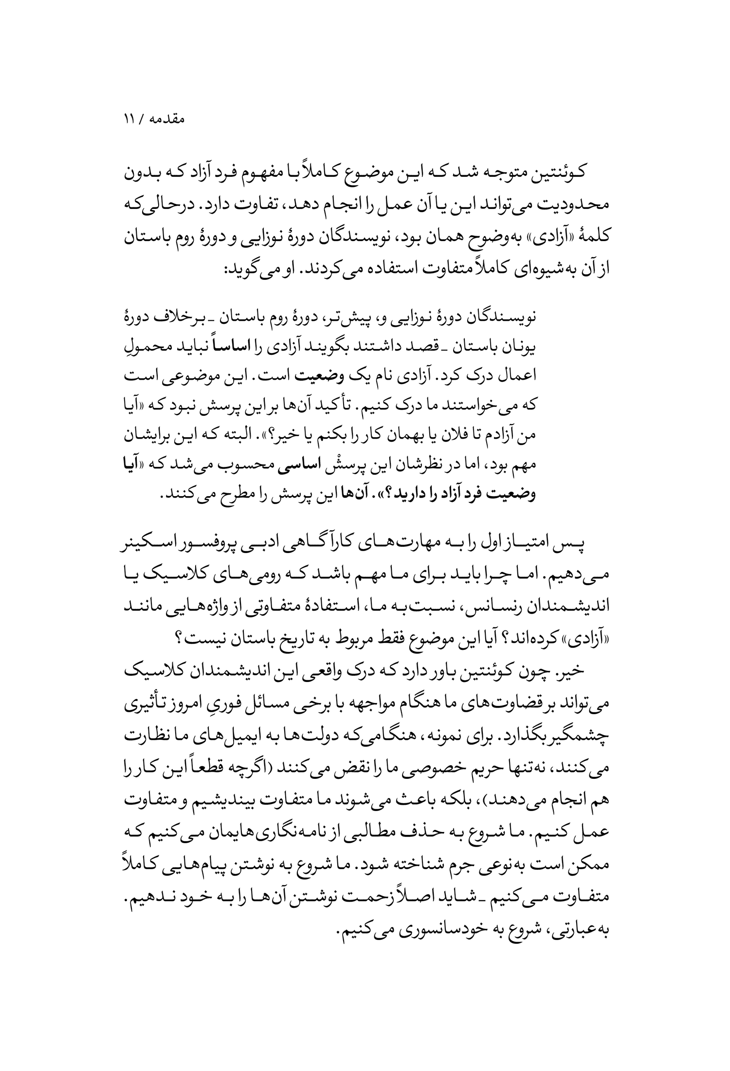 در این اثر، آزادی نه حقی انتزاعی، بلکه مسئولیتی سیاسی و اخلاقی است؛ مسئولیتی که فقط در مشارکت فعال شهروندان معنا پیدا میکند. اسکینر با تمایزگذاری بین سه سنت اصلی تاریخ اندیشۀ سیاسی غرب در فهم آزادی، میکوشد تصویری جامع از سیر تحول این مفهوم تا امروز ارائه دهد.