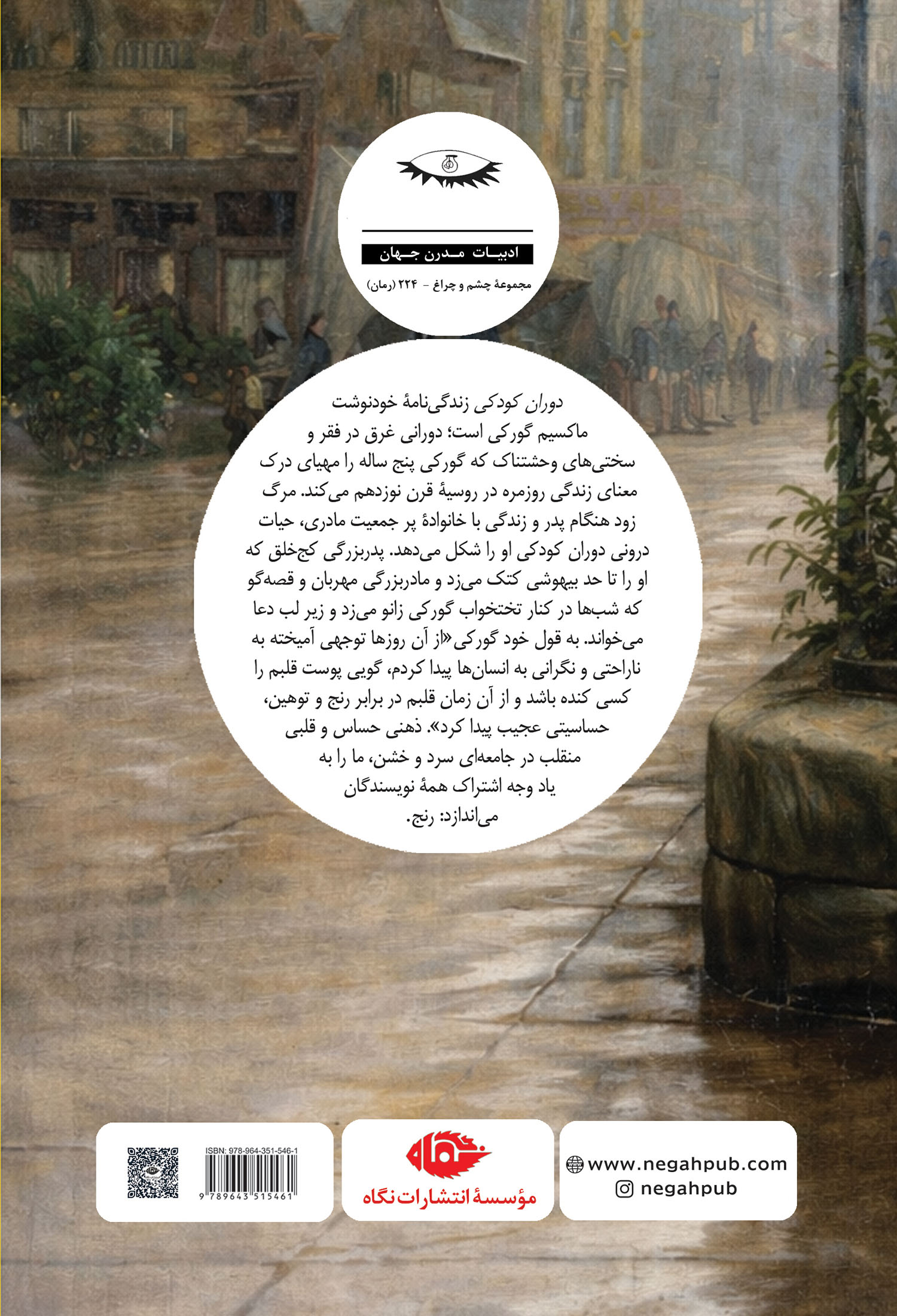 دوران کودکی زندگی‌نامۀ خودنوشت ماکسیم گورکی است؛ دورانی غرق در فقر و سختی‌های وحشتناک که گورکی پنج ساله را مهیای درک معنای زندگی روزمره در روسیۀ قرن نوزدهم می‌کند. مرگ زود هنگام پدر و زندگی با خانوادۀ پر جمعیت مادری، حیات درونی دوران کودکی او را شکل می‌دهد. پدربزرگی کج‌خلق که او را تا حد بیهوشی کتک می‌زد و مادربزرگی مهربان و قصه‌گو که شب‌ها در کنار تختخواب گورکی زانو می‌زد و زیر لب دعا می‌خواند. به قول خود گورکی«از آن روزها توجهی آمیخته به ناراحتی و نگرانی به انسان‌ها پیدا کردم، گویی پوست قلبم را کسی کنده باشد و از آن زمان قلبم در برابر رنج و توهین، حساسیتی عجیب پیدا کرد». ذهنی حساس و قلبی منقلب در جامعه‌ای سرد و خشن، ما را به یاد وجه اشتراک همۀ نویسندگان می‌اندازد: رنج