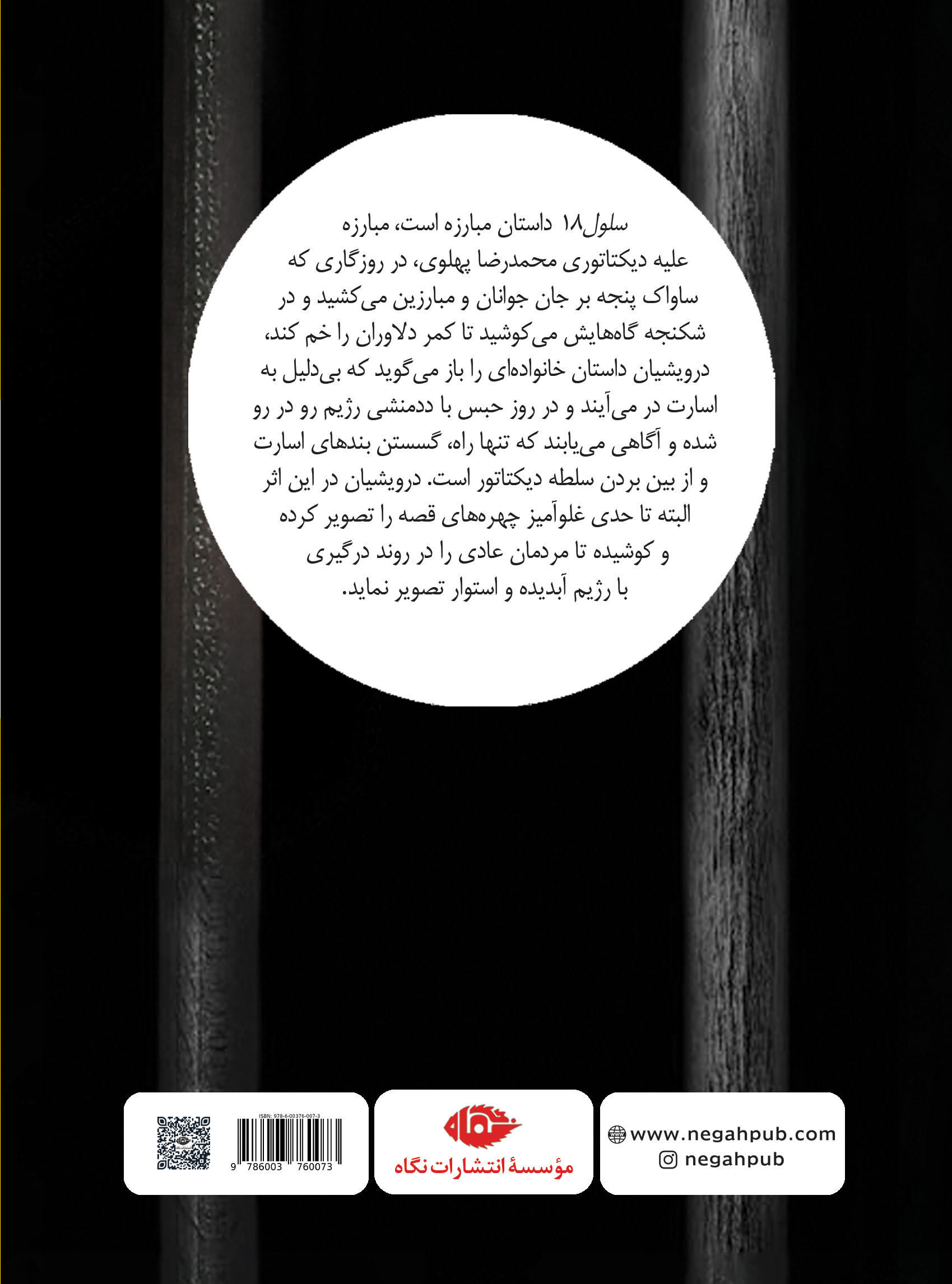 سلول 18 داستان مبارزه است، مبارزه علیه دیکتاتوری محمدرضا پهلوی، در روزگاری که ساواک پنجه بر جان جوانان و مبارزین میکشید و در شکنجهگاههایش میکوشید تا کمر دلاوران را خم کند ، درویشیان داستان خانوادهای را باز میگوید که بی دلیل به اسارت در می‏;‏آیند و در روز حبس با ددمنشی رژیم رو در رو شده و آگاهی مییابند که تنها راه، گسستن بندهای اسارت و از بین بردن سلطه دیکتاتور است‏.‏ درویشیان در این اثر البته تا حدی غلو آمیز چهرههای قصه را تصویر کرده و کوشیده تا مردمان عادی را در روند درگیری با رژیم آبدیده و استوار تصویر نماید‏.‏