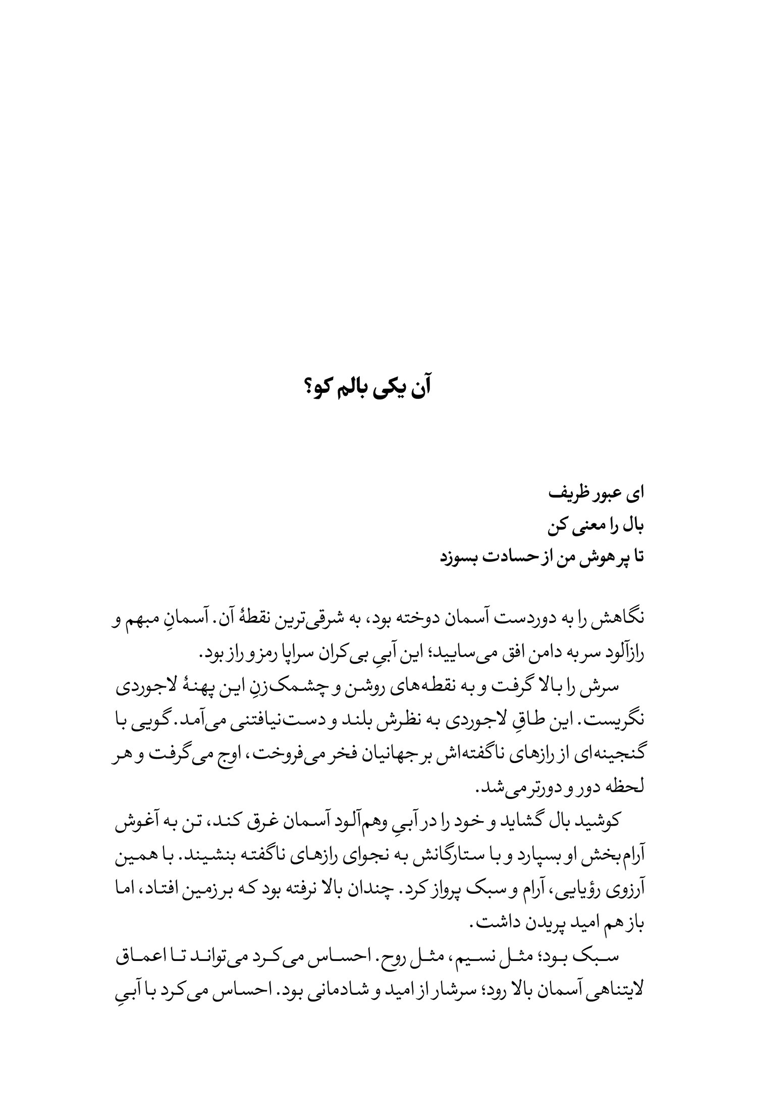 کوشید بال گشاید و خود را در آبیِ وهم‌آلود آسمان غرق کند، تن به آغوش آرام‌بخش او بسپارد و با ستارگانش به نجوای رازهای ناگفته بنشیند. با همین آرزوی رؤیایی، آرام و سبک پرواز کرد. چندان بالا نرفته بود که بر زمین افتاد، اما باز هم امید پريدن داشت.