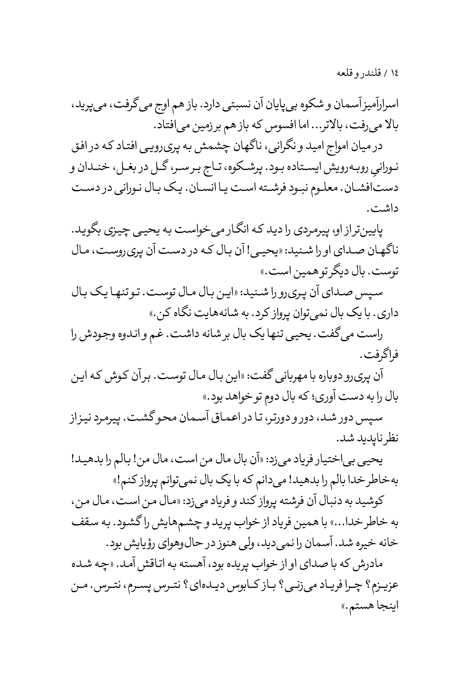 سپس صدای آن پری‌رو را شنید: «این بال مال توست. تو تنها یک بال داری. با یک بال نمی‌توان پرواز کرد. به شانه‌هایت نگاه کن.»